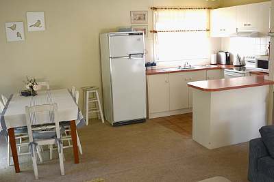 The open plan living area has a fully equipped kitchen with electric stove, microwave, fridge/freezer and all utensils and tableware to cater for up to 5 people.